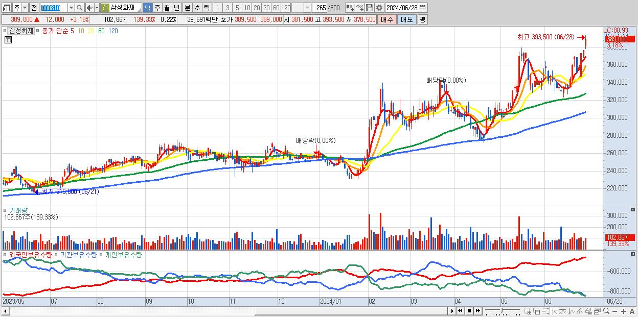 - 삼성화재 (389,000원 ▲ 3.18% , 시총: 184,288억, 외국인 순매수 거래금:90억)