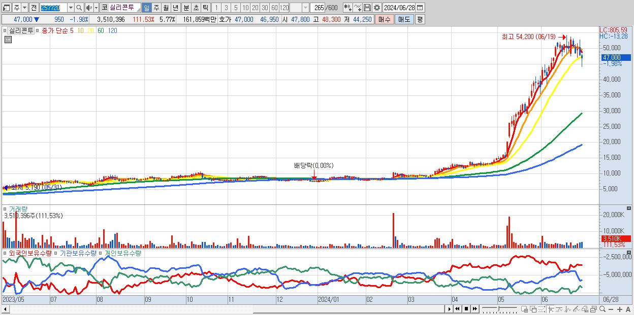 - 실리콘투 (47,000원 ▼ -1.98% , 시총: 28,610억, 외국인 순매수 거래금:110억)