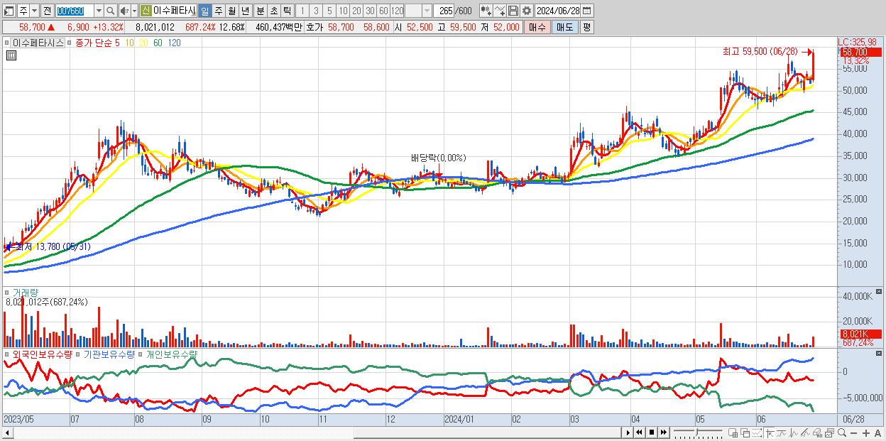 1.이수페타시스 58,700원 ▲ 13.32% (KOSPI, 007660)
