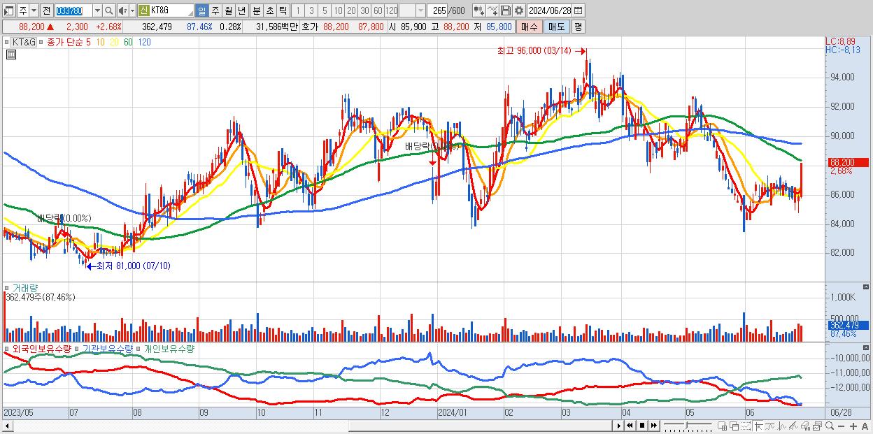 - KT&G (88,200원 ▲ 2.68% , 시총: 114,944억, 외국인 순매수 거래금:112억)