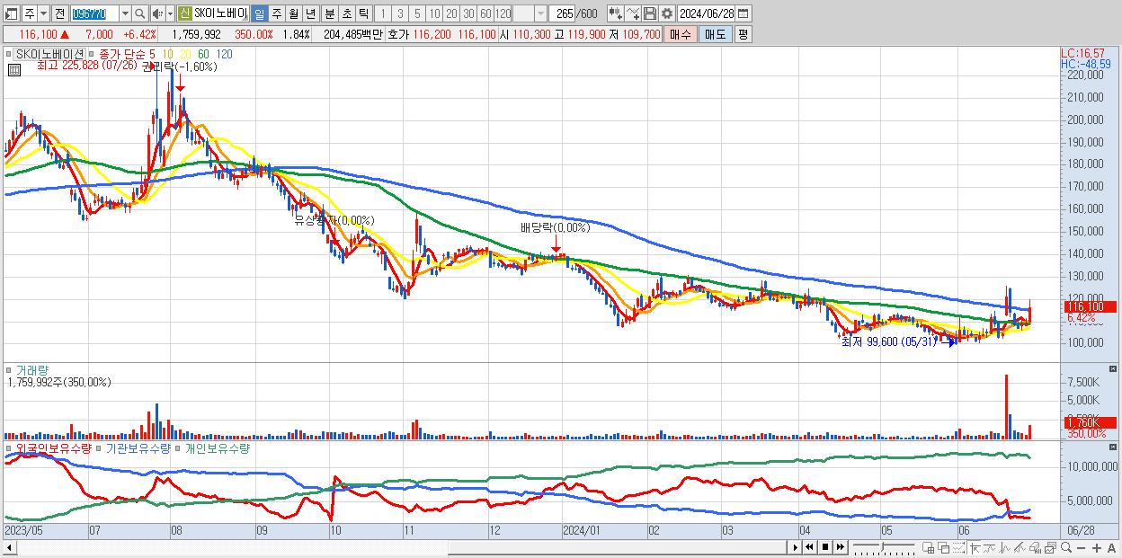 - SK이노베이션 (116,100원 ▲ 6.42% , 시총: 111,149억, 외국인 순매수 거래금:266억)