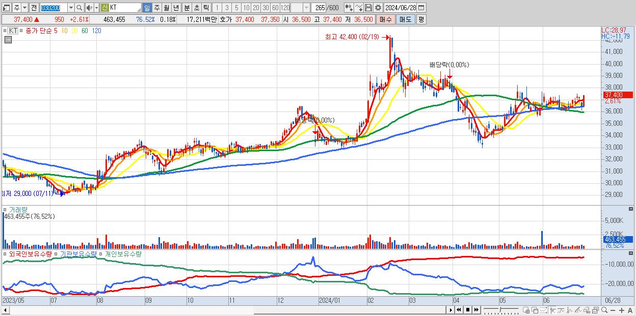 - KT (37,400원 ▲ 2.61% , 시총: 94,256억, 외국인 순매수 거래금:70억)