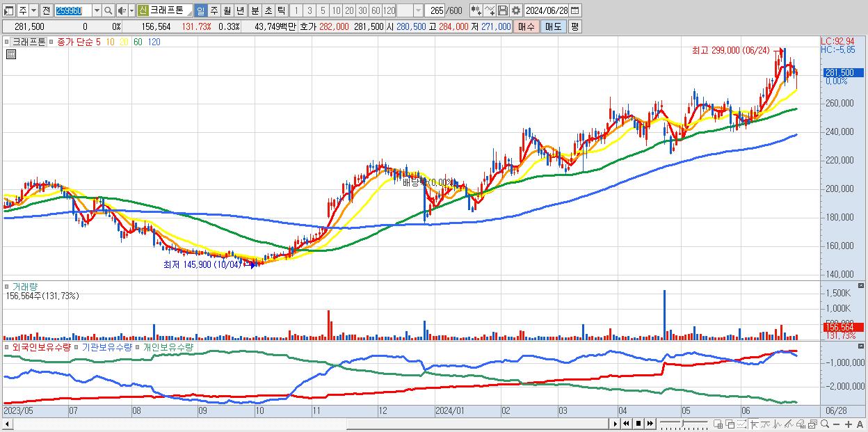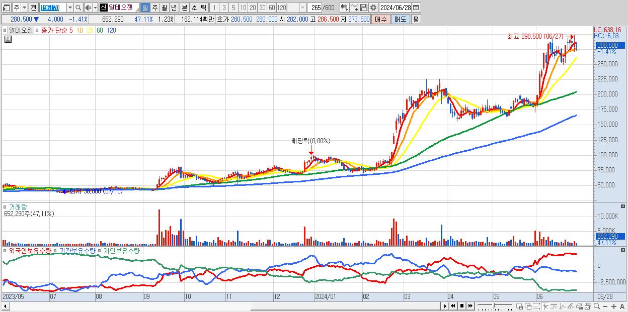 - 알테오젠 (280,500원 ▼ -1.41% , 시총: 149,082억, 외국인 순매수 거래금:136억)
