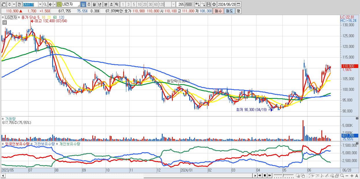 - LG전자 (110,900원 ▲ 1.56% , 시총: 181,485억, 외국인 순매수 거래금:146억)