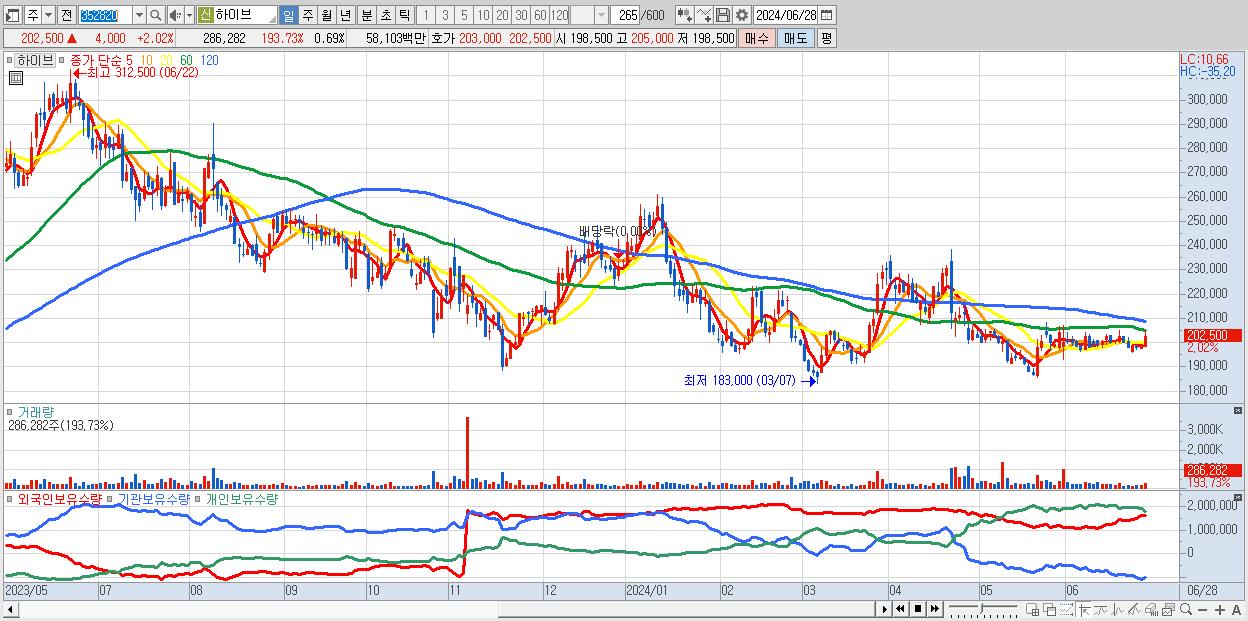 - 하이브 (202,500원 ▲ 2.02% , 시총: 84,345억, 외국인 순매수 거래금:196억)