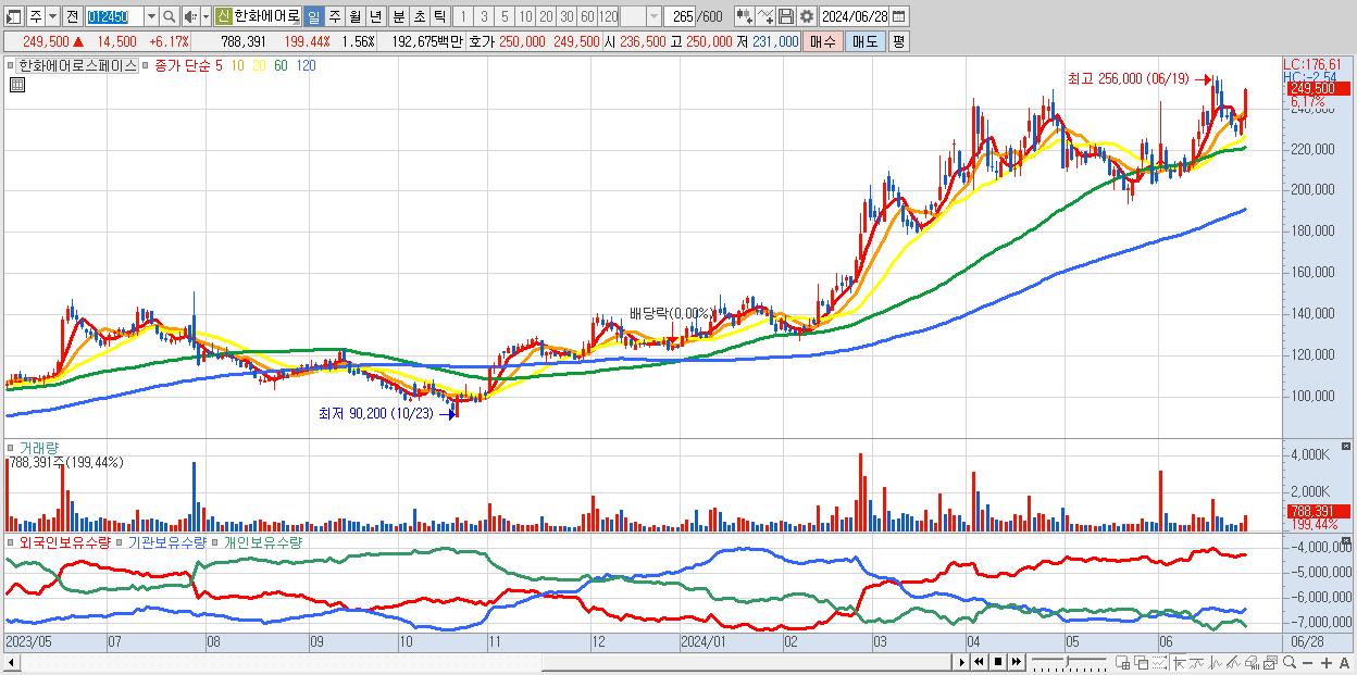 - 한화에어로스페이스 (249,500원 ▲ 6.17% , 시총: 126,322억, 외국인 순매수 거래금:300억)