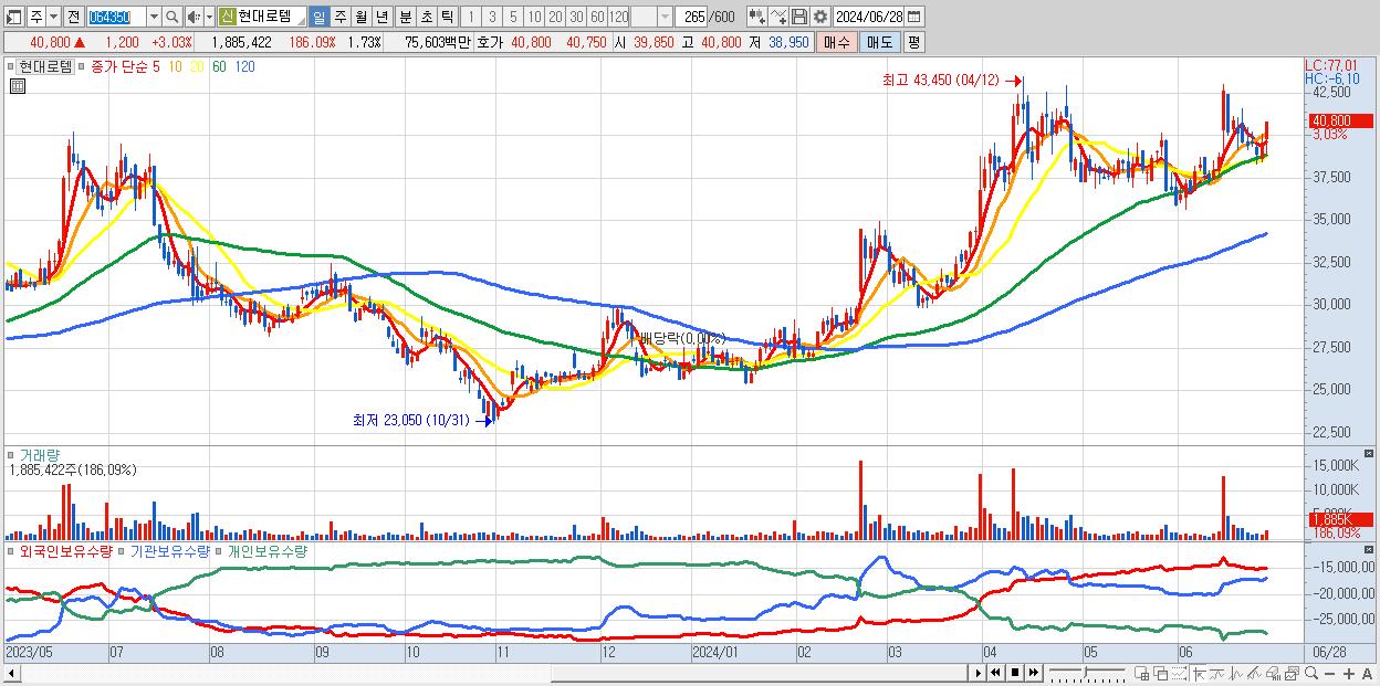 - 현대로템 (40,800원 ▲ 3.03% , 시총: 44,530억, 외국인 순매수 거래금:125억)
