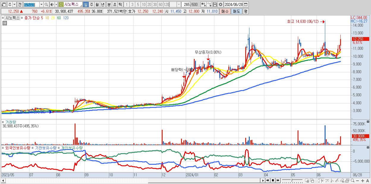 - 시노펙스 (12,250원 ▲ 6.61% , 시총: 10,268억, 외국인 순매수 거래금:289억)