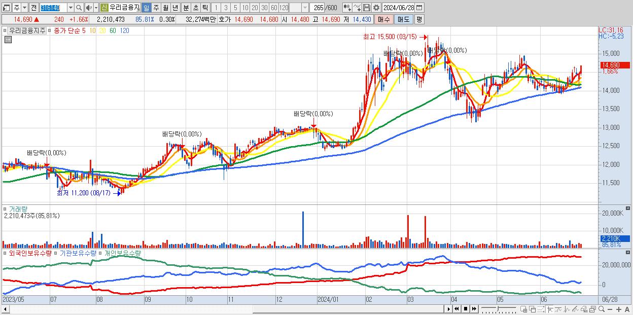 - 우리금융지주 (14,690원 ▲ 1.66% , 시총: 109,087억, 외국인 순매수 거래금:69억)