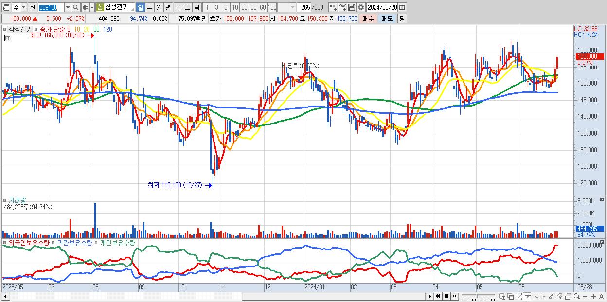 - 삼성전기 (158,000원 ▲ 2.27% , 시총: 118,016억, 외국인 순매수 거래금:422억)