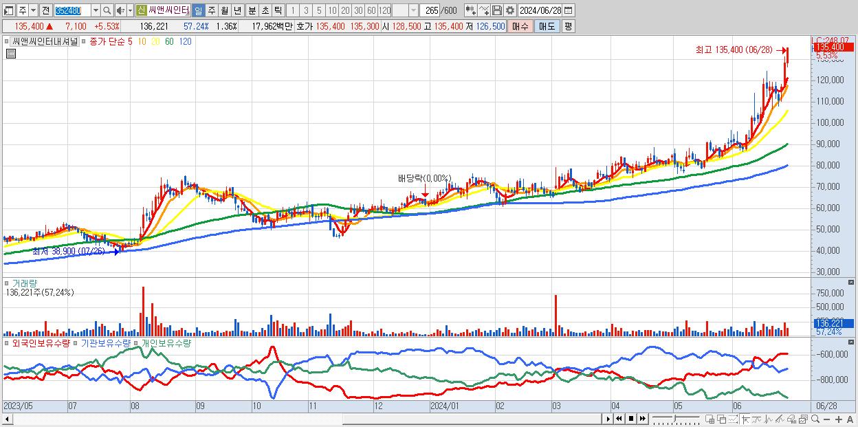 - 씨앤씨인터내셔널 (135,400원 ▲ 5.53% , 시총: 13,559억, 거래량: 136,336, 거래대금:180억, KOSDAQ)