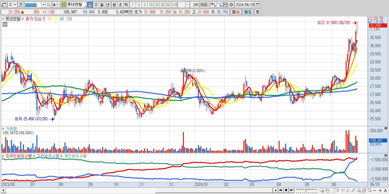- 롯데렌탈 (31,250원 ▲ 1.13% , 시총: 11,448억, 거래량: 109,374, 거래대금:34억, KOSPI)