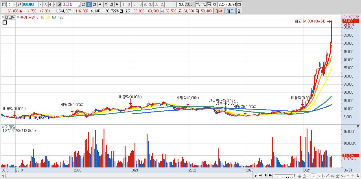 - 테크윙 (63,800원 ▲ 24.61% , 시총: 23,832억, 거래량: 4,877,907, 거래대금:2,791억)