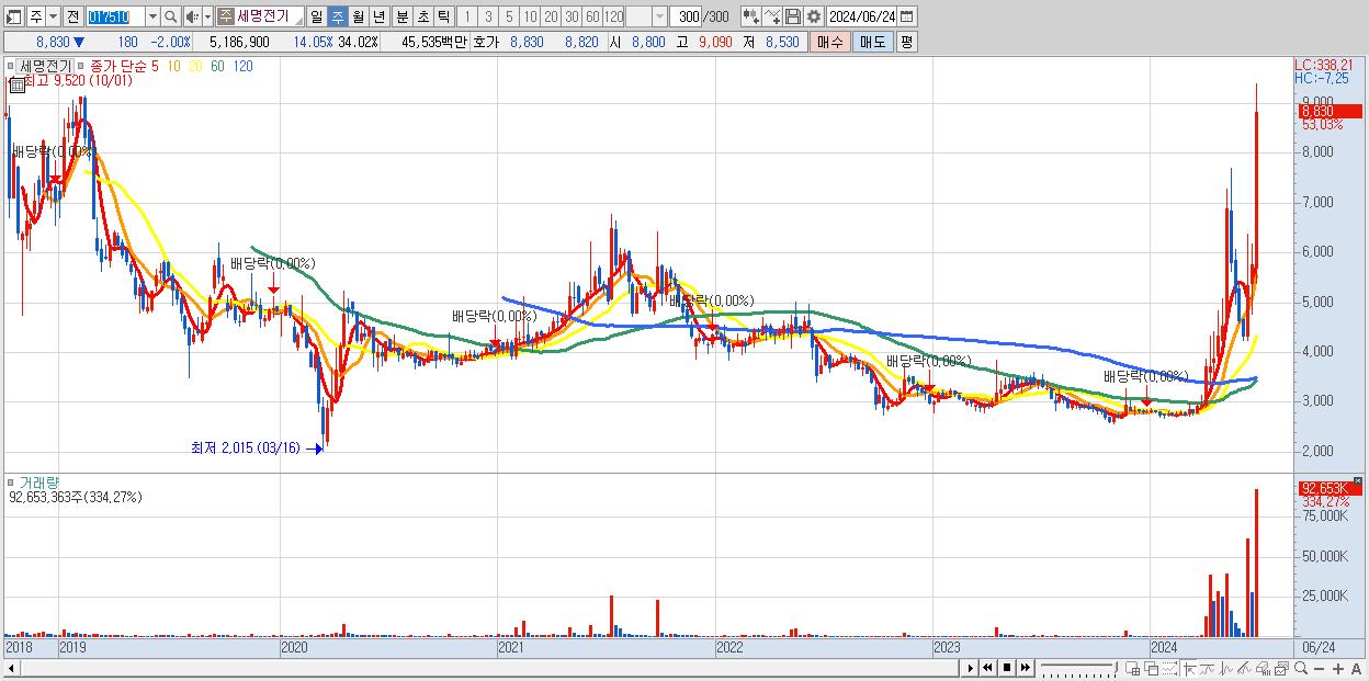 - 세명전기 (8,830원 ▲ 53.03% , 시총: 1,346억, 거래량: 92,653,363, 거래대금:7,101억)