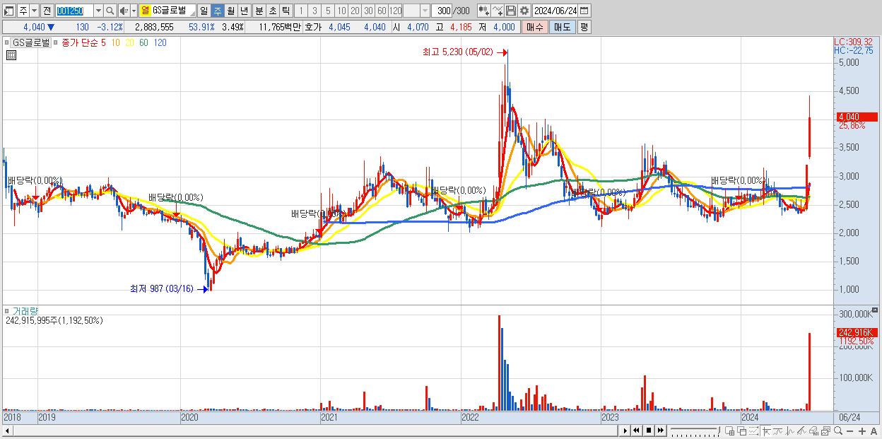 - GS글로벌 (4,040원 ▲ 25.86% , 시총: 3,334억, 거래량: 242,915,995, 거래대금:9,561억)