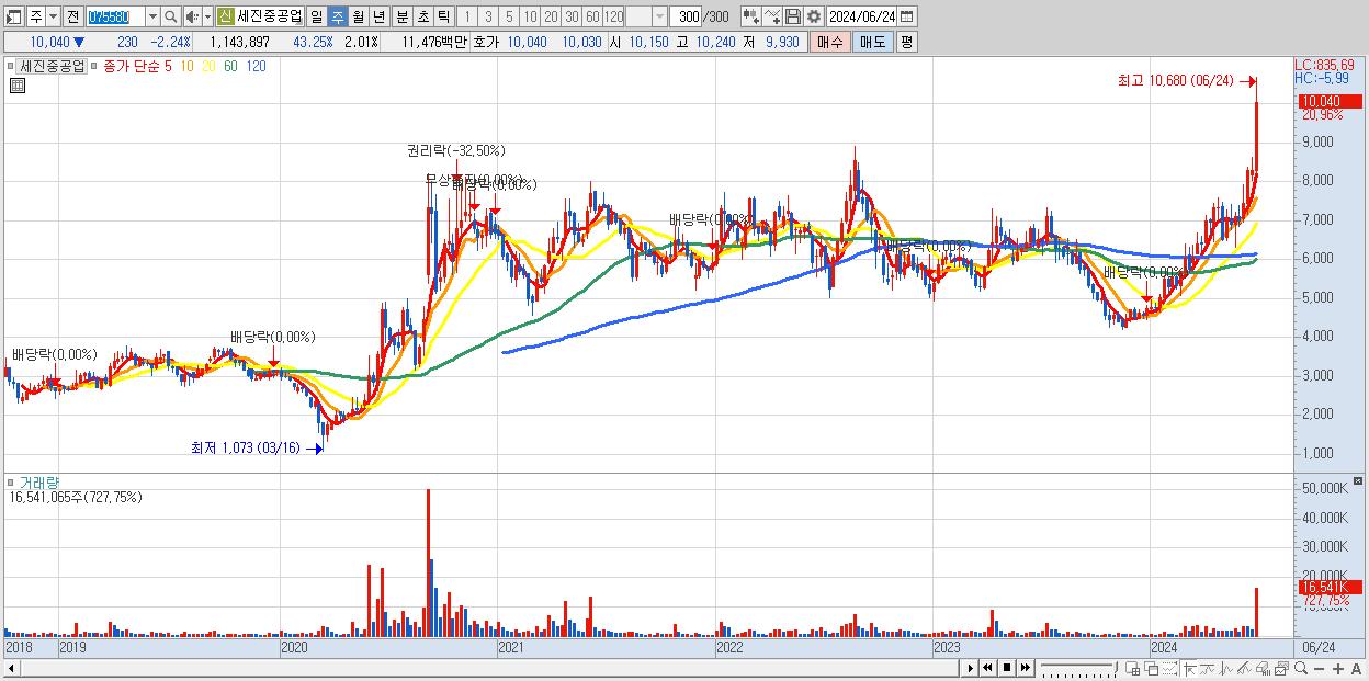 - 세진중공업 (10,040원 ▲ 20.96% , 시총: 5,708억, 거래량: 16,541,065, 거래대금:1,620억)