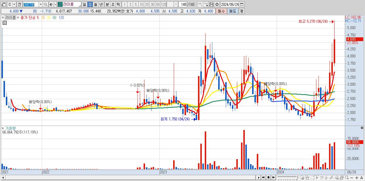 - 라이콤 (4,600원 ▲ 21.05% , 시총: 1,376억, 거래량: 66,064,792, 거래대금:3,052억)