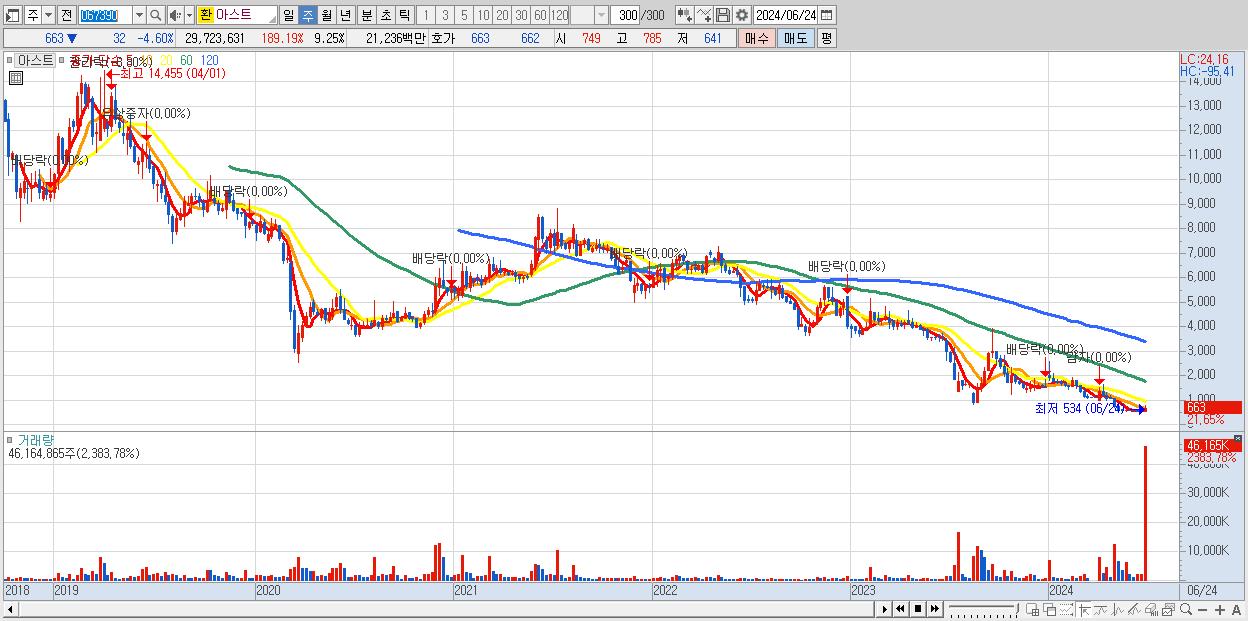 - 아스트 (663원 ▲ 21.65% , 시총: 2,130억, 거래량: 46,164,865, 거래대금:322억)