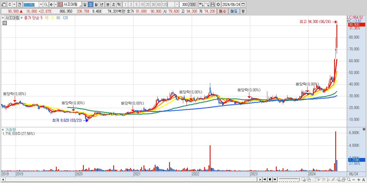 - 사조대림 (90,900원 ▲ 31.36% , 시총: 8,331억, 거래량: 1,716,333, 거래대금:1,354억)