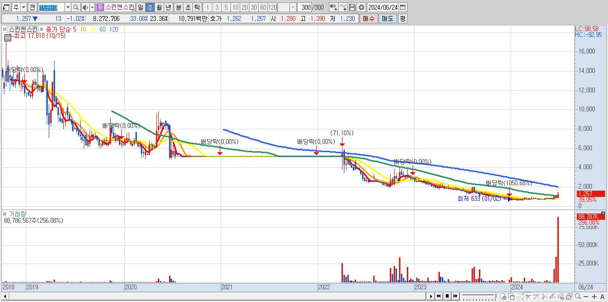 - 스킨앤스킨 (1,257원 ▲ 39.05% , 시총: 445억, 거래량: 88,786,567, 거래대금:1,054억)
