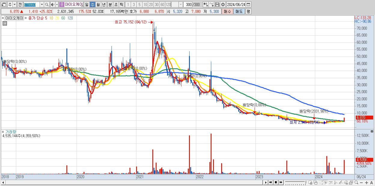 - 아이오케이 (6,870원 ▲ 68.18% , 시총: 347억, 거래량: 4,535,144, 거래대금:286억)