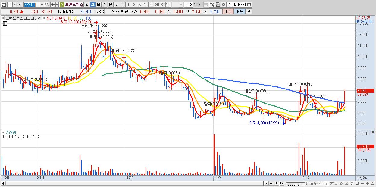 - 브랜드엑스코퍼레이션 (6,950원 ▲ 22.79% , 시총: 2,034억, 거래량: 10,256,247, 거래대금:673억)