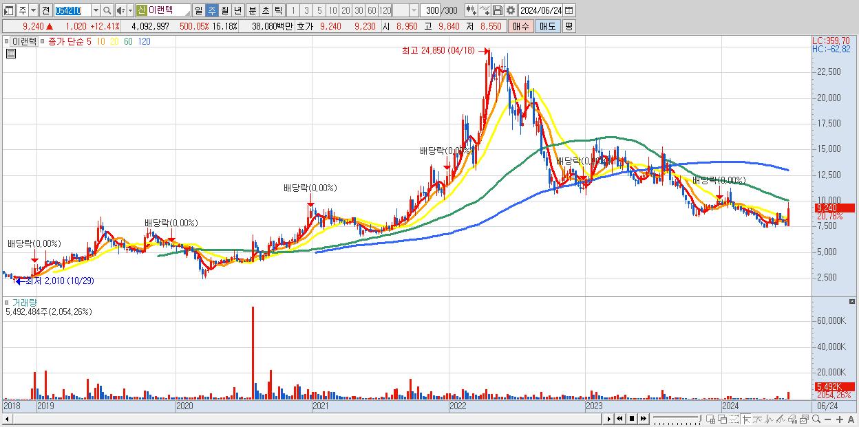- 이랜텍 (9,240원 ▲ 20.78% , 시총: 2,337억, 거래량: 5,492,484, 거래대금:498억)