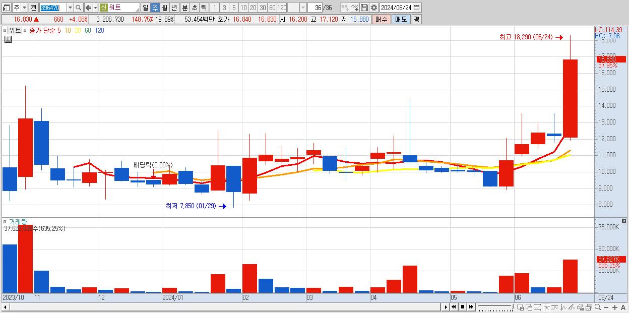 - 워트 (16,830원 ▲ 37.95% , 시총: 2,713억, 거래량: 37,626,638, 거래대금:5,915억)