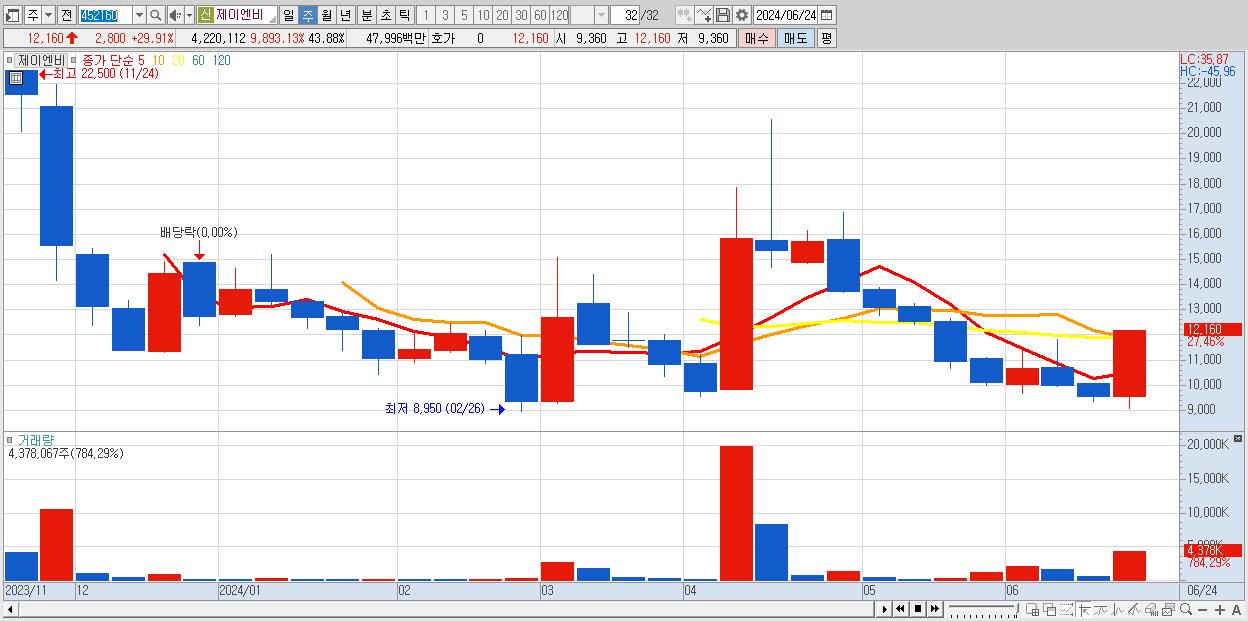 - 제이엔비 (12,160원 ▲ 27.46% , 시총: 1,169억, 거래량: 4,378,067, 거래대금:495억)
