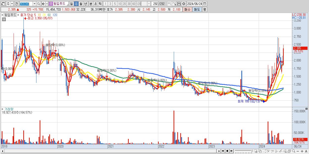 - 윙입푸드 (2,385원 ▲ 26.53% , 시총: 1,144억, 거래량: 18,927,433, 거래대금:432억)