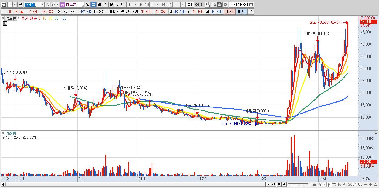 - 펩트론 (49,350원 ▲ 24.94% , 시총: 10,194억, 거래량: 7,491,726, 거래대금:3,300억)
