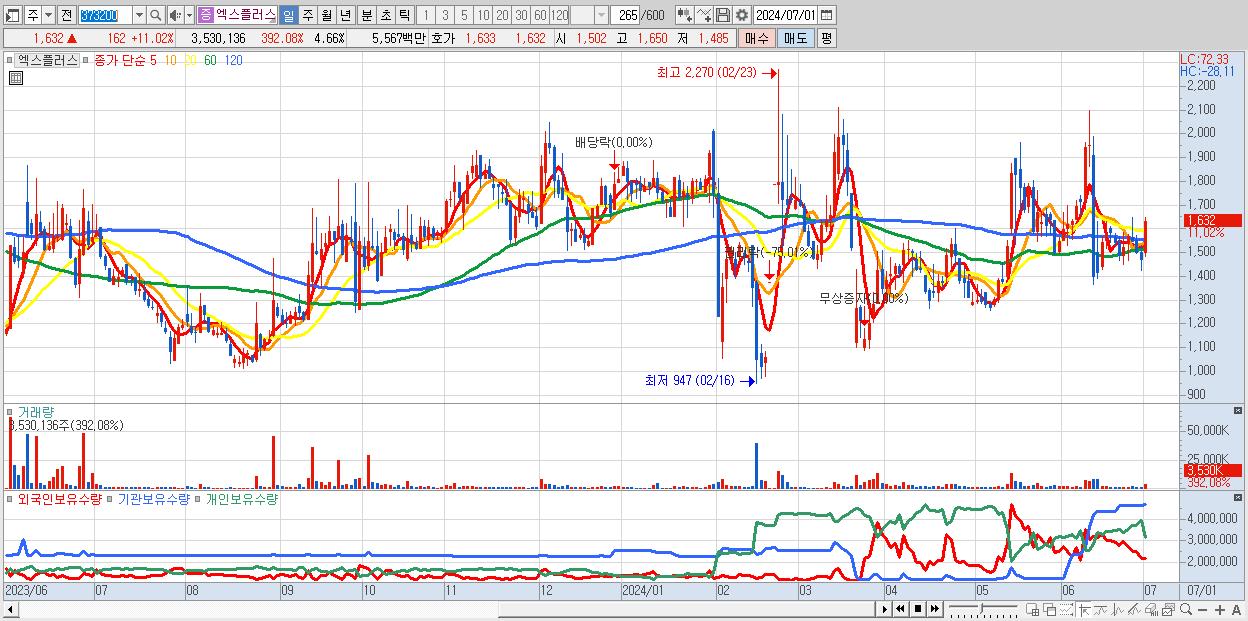 - 엑스플러스 (1,632원 ▲ 11.02% , 시총: 1,236억, 거래량: 3,530,136, 거래대금:56억)