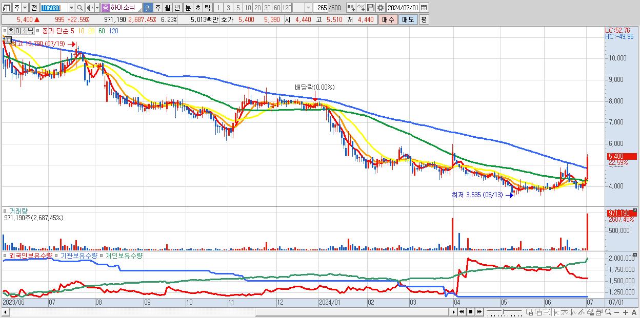 - 하이소닉 (5,400원 ▲ 22.59% , 시총: 842억, 거래량: 971,190, 거래대금:50억)