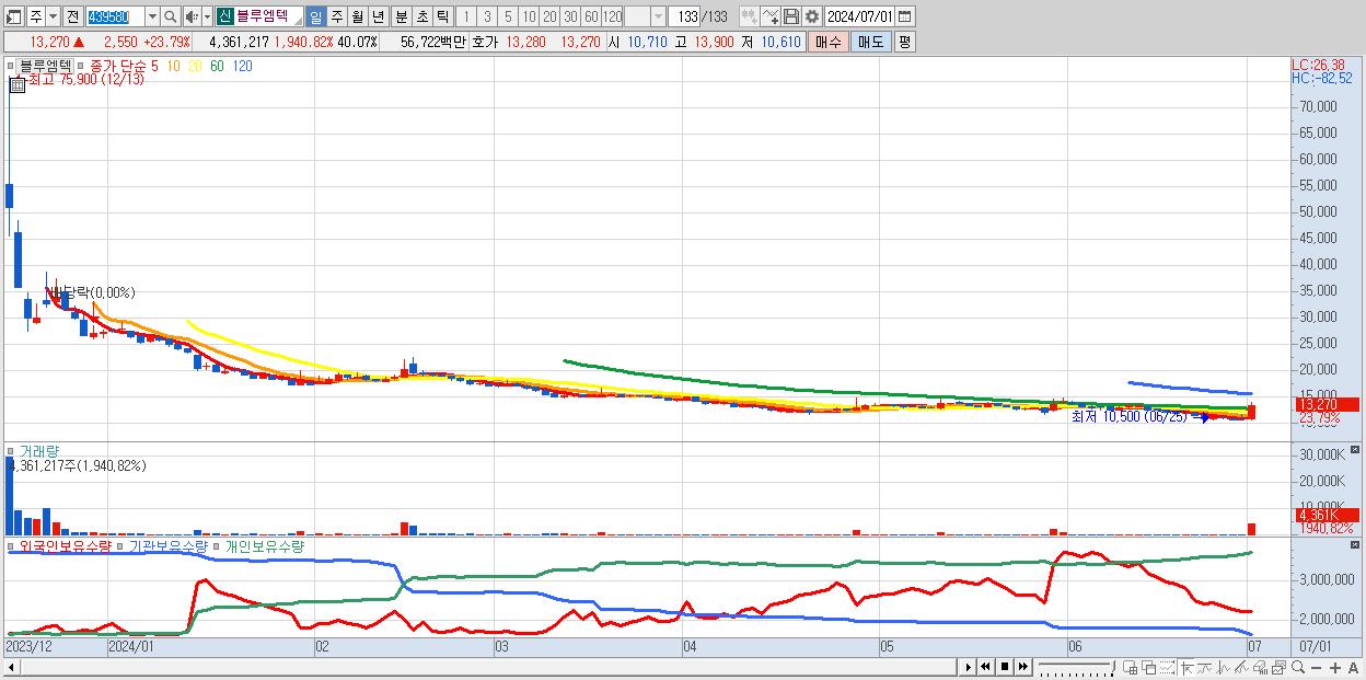 - 블루엠텍 (13,270원 ▲ 23.79% , 시총: 1,444억, 거래량: 4,361,217, 거래대금:567억)
