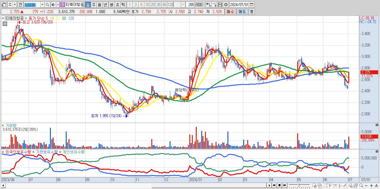 - 티웨이항공 (2,725원 ▲ 11.22% , 시총: 5,869억, 거래량: 3,610,375, 거래대금:95억)