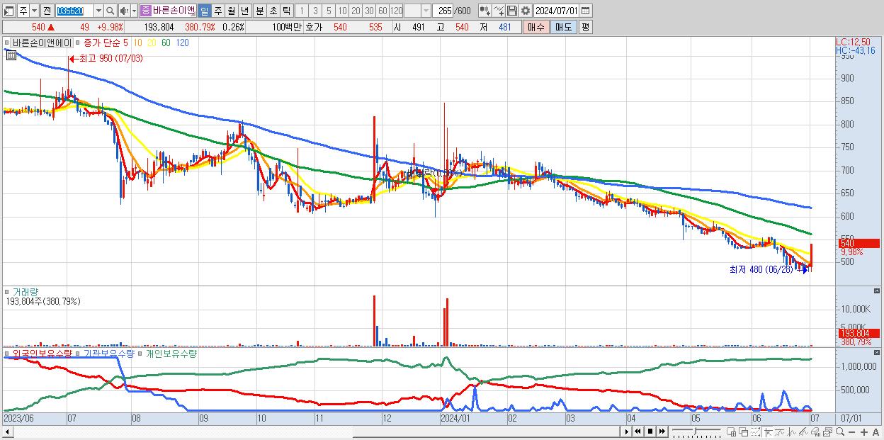 - 바른손이앤에이 (540원 ▲ 9.98% , 시총: 402억, 거래량: 193,804, 거래대금:1억)