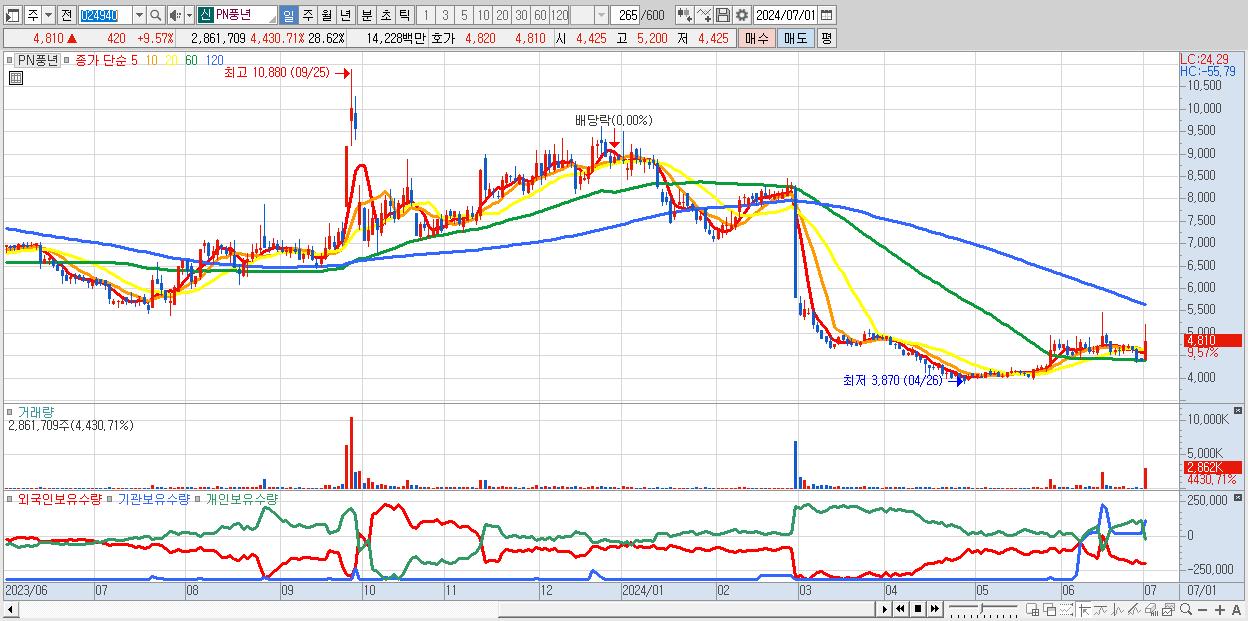 - PN풍년 (4,810원 ▲ 9.57% , 시총: 481억, 거래량: 2,861,709, 거래대금:142억)