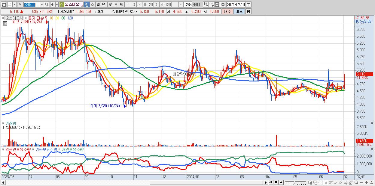 - 오스테오닉 (5,110원 ▲ 11.69% , 시총: 1,056억, 거래량: 1,429,687, 거래대금:72억)
