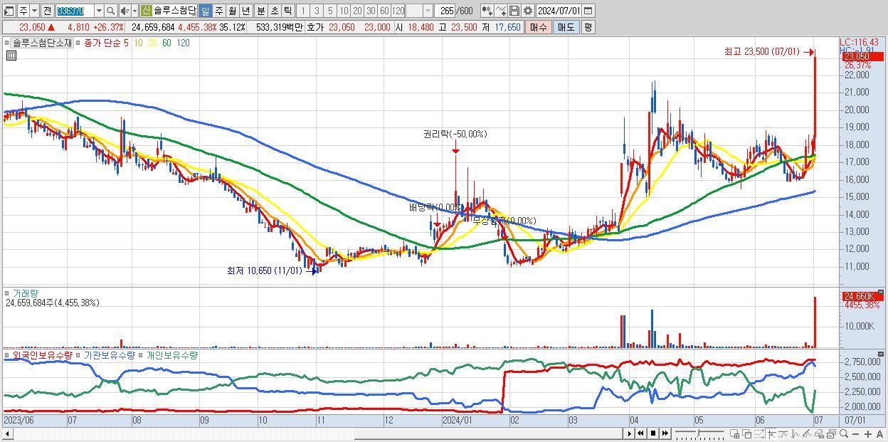 - 솔루스첨단소재 (23,050원 ▲ 26.37% , 시총: 16,185억, 거래량: 24,659,684, 거래대금:5,333억)