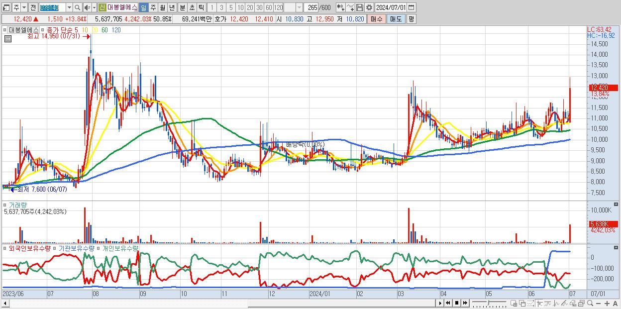 - 대봉엘에스 (12,420원 ▲ 13.84% , 시총: 1,377억, 거래량: 5,637,705, 거래대금:692억)