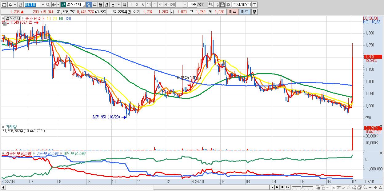 - 일신석재 (1,203원 ▲ 19.94% , 시총: 932억, 거래량: 31,396,782, 거래대금:372억)