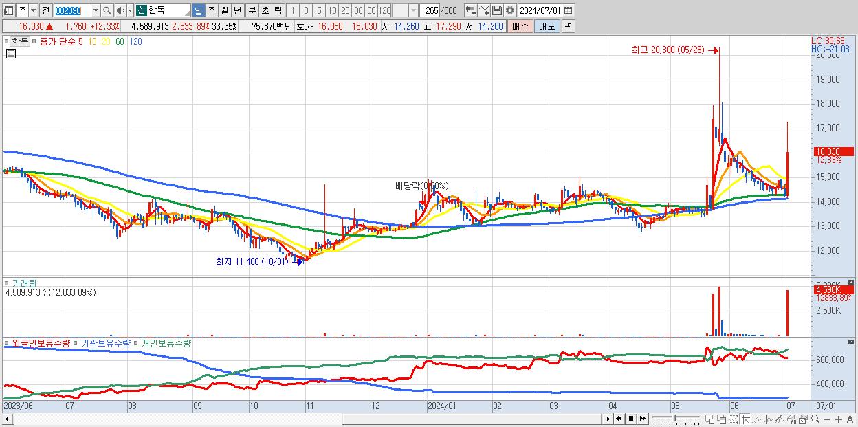 - 한독 (16,030원 ▲ 12.33% , 시총: 2,206억, 거래량: 4,589,913, 거래대금:759억)