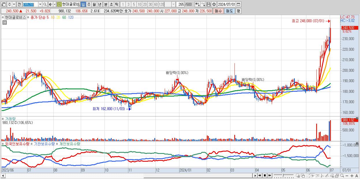 - 현대글로비스 (240,500원 ▲ 9.82% , 시총: 90,188억, 거래량: 980,132, 거래대금:2,346억)