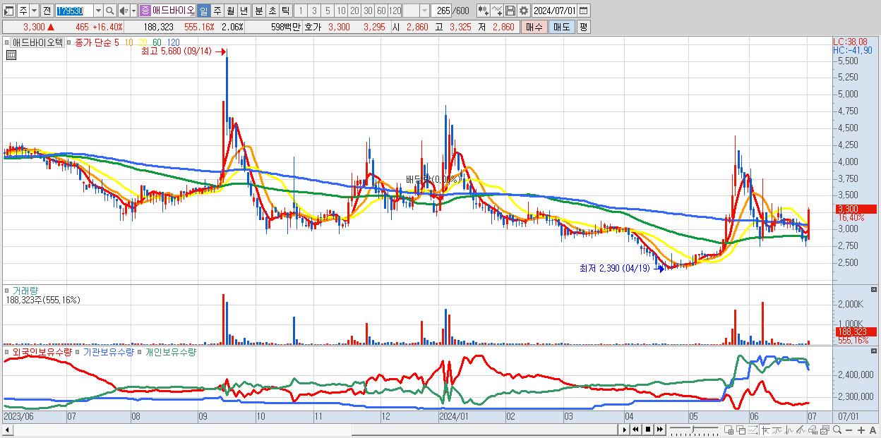 - 애드바이오텍 (3,300원 ▲ 16.4% , 시총: 302억, 거래량: 188,323, 거래대금:6억)