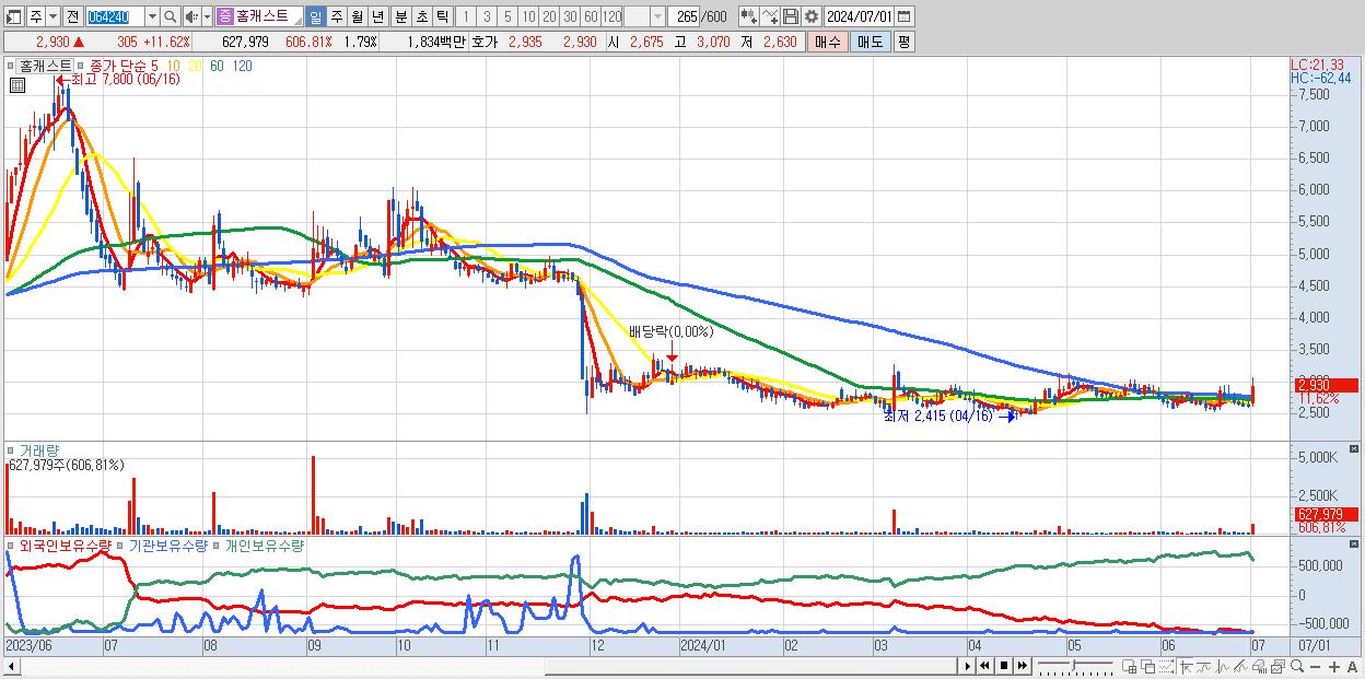 - 홈캐스트 (2,930원 ▲ 11.62% , 시총: 1,027억, 거래량: 627,979, 거래대금:18억)
