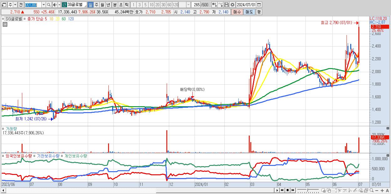 - SG글로벌 (2,710원 ▲ 25.46% , 시총: 1,219억, 거래량: 17,336,443, 거래대금:452억)