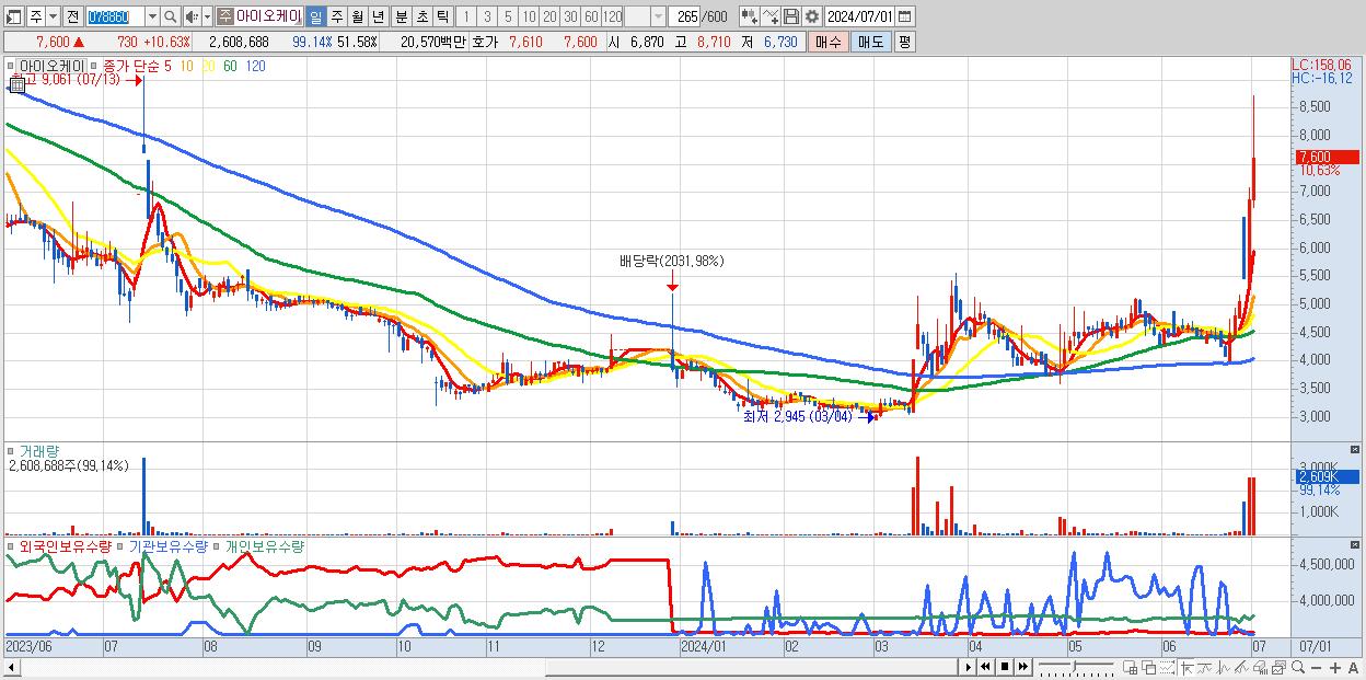 - 아이오케이 (7,600원 ▲ 10.63% , 시총: 384억, 거래량: 2,608,688, 거래대금:206억)