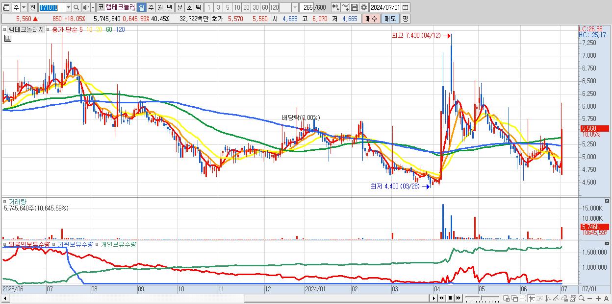 - 램테크놀러지 (5,560원 ▲ 18.05% , 시총: 790억, 거래량: 5,745,640, 거래대금:327억)