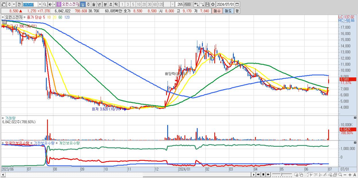 - 오킨스전자 (8,580원 ▲ 17.37% , 시총: 1,517억, 거래량: 6,842,022, 거래대금:600억)