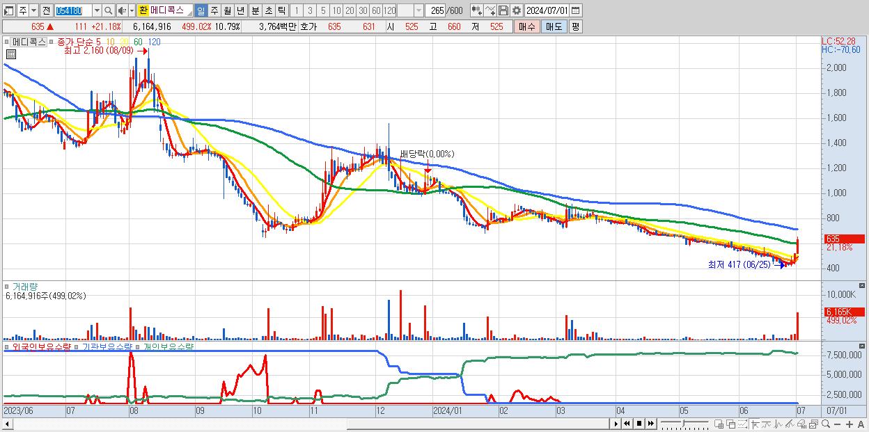 - 메디콕스 (635원 ▲ 21.18% , 시총: 363억, 거래량: 6,164,916, 거래대금:38억)